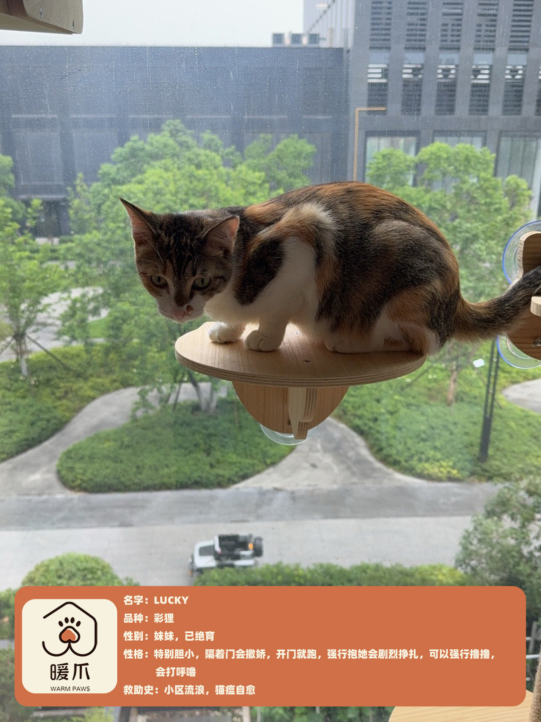 名字:Lucky品种:彩狸性别:妹妹,已绝育性格:特别胆小,隔着门会撒娇,开门就跑,强行抱她会剧烈挣扎,可以强行撸撸,会打呼噜救助史:小区流浪,猫瘟自愈